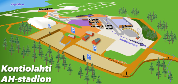 Katso kartasta pysäköintialueen, puku- ja pesutilojen sekä kilpailutoimiston sijainti.